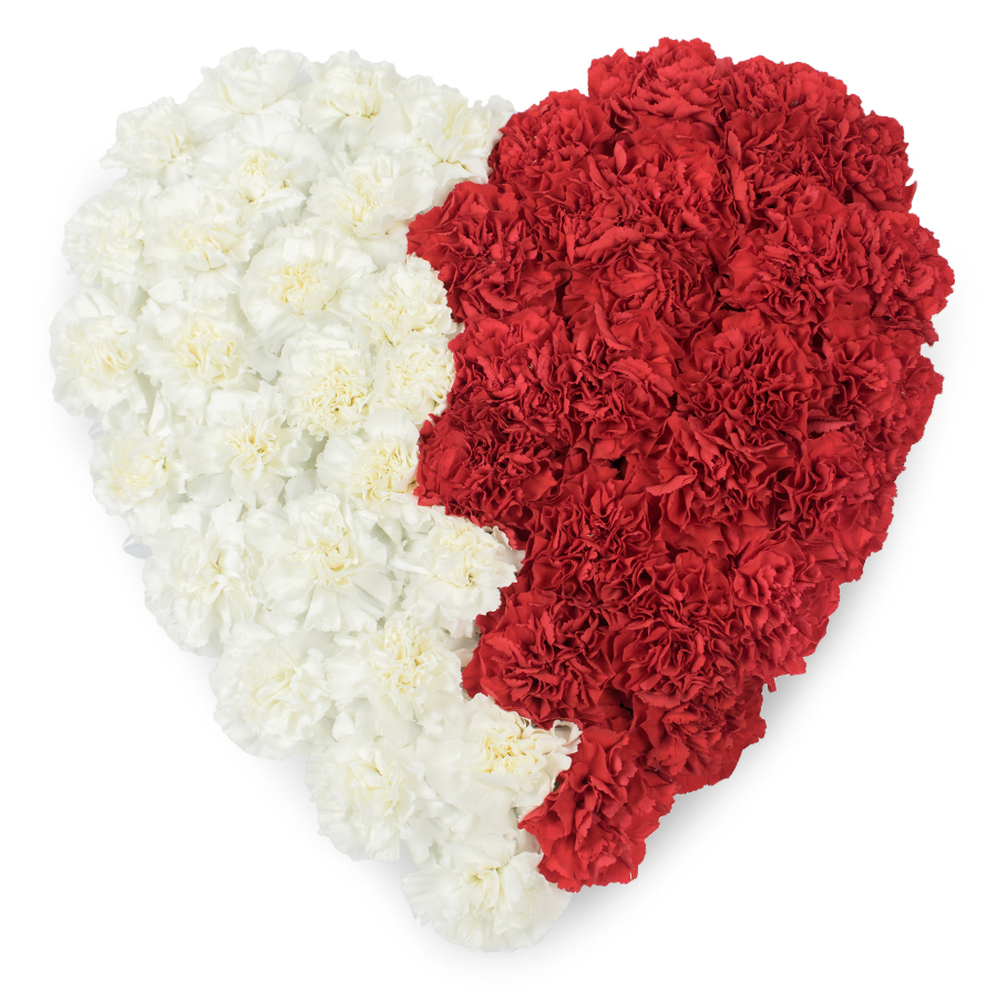 Introducing our Lovely Heart Bouquet, a perfect harmony of white and red carnations artfully arranged in a heart shape. This charming bouquet is ideal for expressing your deepest emotions, whether offering sympathy or celebrating love.